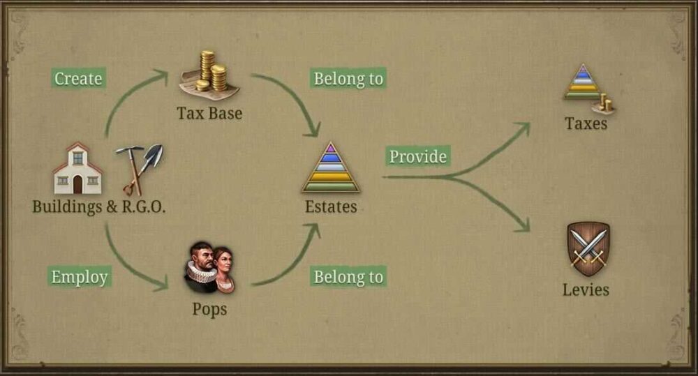 鋳造には首都市場に実物の金が必要で身分税は各社会階級に属するPOPの所得と、あなたの支配度に依存。税を上げすぎると身分不満が高まり内戦を招く。交易は、存在感のある各市場での交易利益に依存。