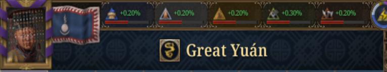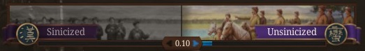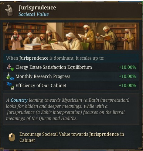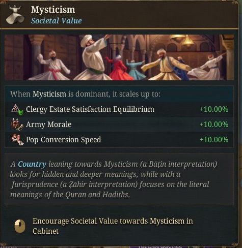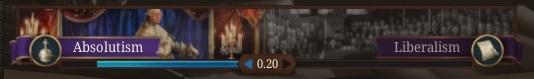 イスラム諸国の独自の社会価値である敬虔度は通貨ではなく神秘主義と法学主義のスライダーとして表現され、社会階級特権やイベントなどに応じて両端に揺れ動きます。また、中国化のような社会価値やゲーム後半で解禁される絶対主義なども存在します。各国家の社会価値は歴史的背景を反映したスライダーの初期位置から開始し、内閣のキャラクターを任命したり法律に基づいて政策を制定したりすることや、イベントなどでもスライダーの位置が変化していきます。