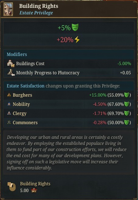 市民、平民、貴族、聖職者の各社会階級に対して社会階級特権を与えることができます。これは一定の補正とともに社会価値の進捗と引き換えになることが多く、例えば、市民に建設権を与えることで建設費は下がりますが、社会価値のスライダーは月ごとに富豪政治へと傾きます。