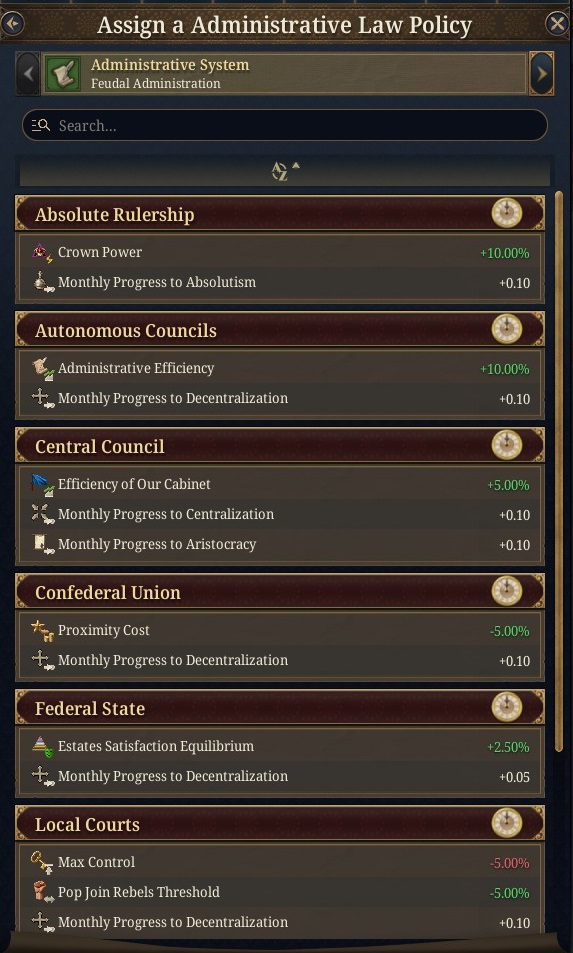 法律は国家の将来を形造る重要な要素であり、行政法、宗教法、軍事法、社会階級法などの分野に分かれています。各法律は複数の政策から構成されており、それら政策は社会的価値に影響を与えたり、各社会階級の満足度に影響を与えることもあります。