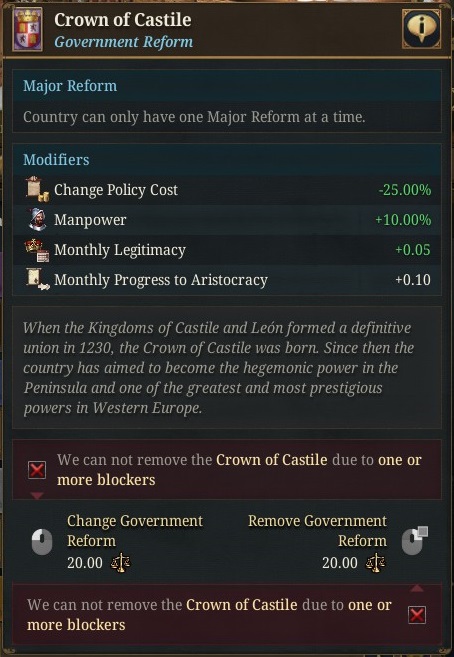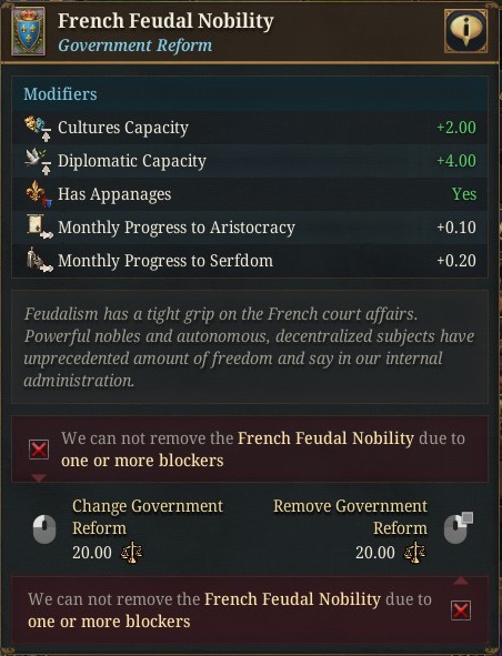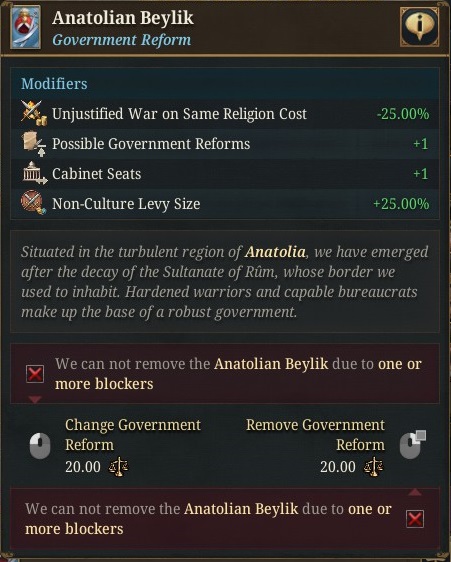政府改革は国家の政治構造の基盤であり、国家が時勢にどう適応するかの選択を続けていくことになります。EU5では多くの国家が固有の政府改革から開始します。例えば、アナトリア君侯国 政府改革、カスティーリャ王冠 政府改革、フランス封建貴族 政府改革などで、他にも時間の経過やイベントを通じて多くの固有の政府改革が存在します。