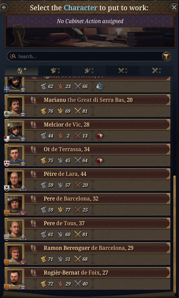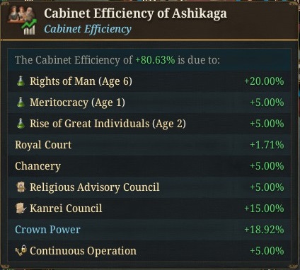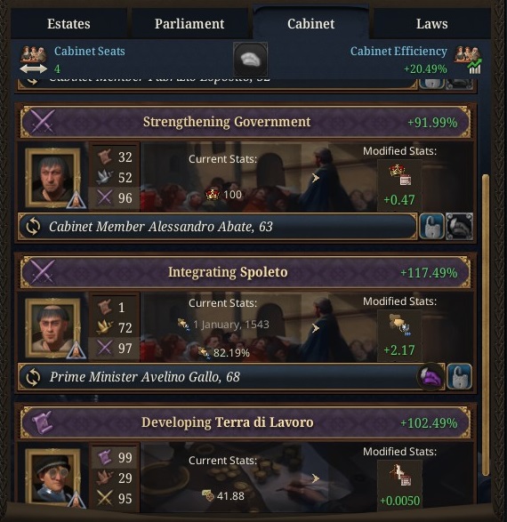 各キャラクターは固有の能力と属性を持ち、これらが任務の効率に作用します。例えば、領土の開発には行政能力が、反乱鎮圧には軍事能力が有効です。統治者の能力は内閣全体の効率に影響するので、得意なところを伸ばしたり弱点を補完することも可能です。また、キャラクターの一人を代表者に任命し、追加の効率ボーナスを与えることもできます。内閣の総合的な効率は文化、法律、技術進歩などの影響も受けます。賢明な人選は極めて重要でその有効性は経済・軍事・外交の成功に直結します。