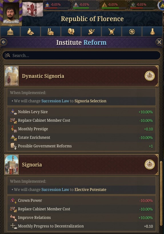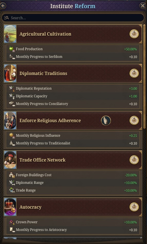 共和国にするか王国にするか、といった国家の形態を変えてしまうような大改革もあります。改革の恩恵は即時ではなく、政策と同様に行政の効率に応じて時間がかかります。国家・文化・宗教・イベントなどにひも付いた大小の固有の改革が多数存在し、国家の進む方向をより深くパーソナライズすることができます。