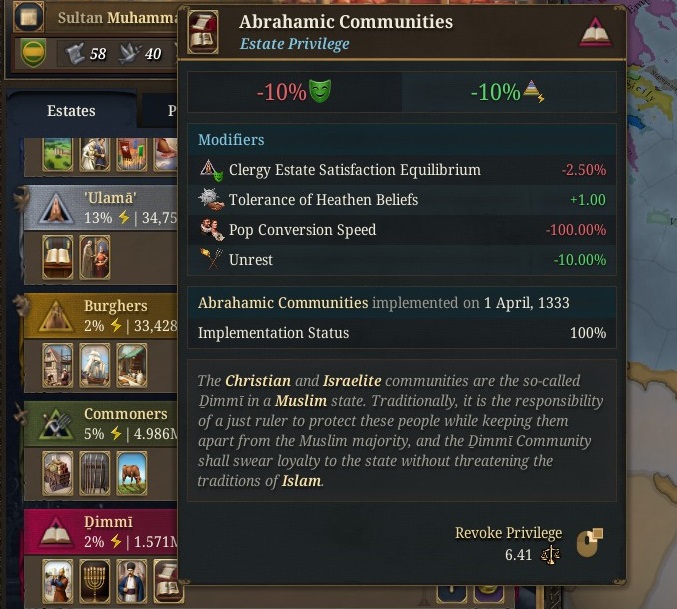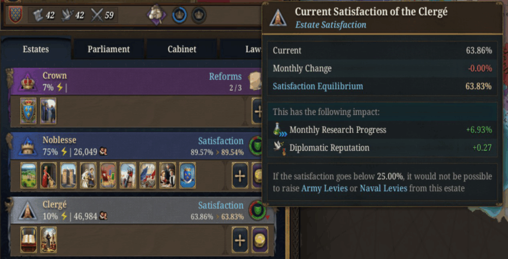 特権とは、王権の一部を各社会階級の具体的な利益と交換することです。その見返りとして、満足度による忠誠心に加え政治的・内政的な支援も得られます。例えば、満足度の高い聖職者は研究成果を向上させます。また、社会階級は議会で議決権を持ち、その投票の重要性は現在の権力と満足度に依存します。