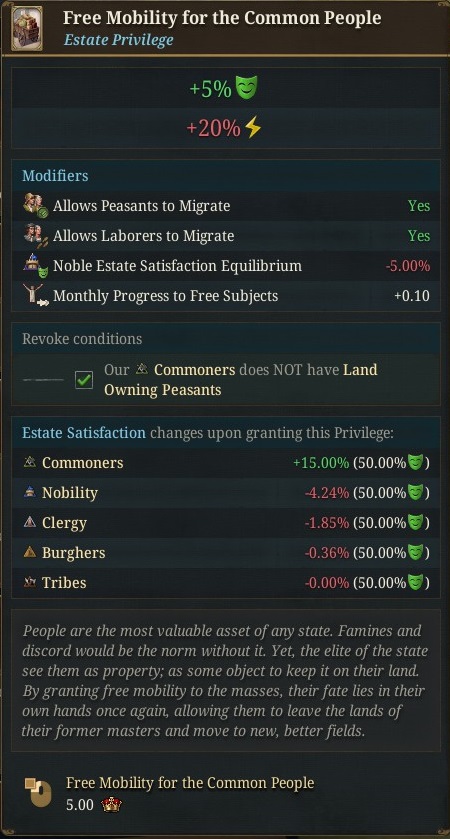 平民に移動の自由の特権を付与すると貴族の満足度が大きく下がる