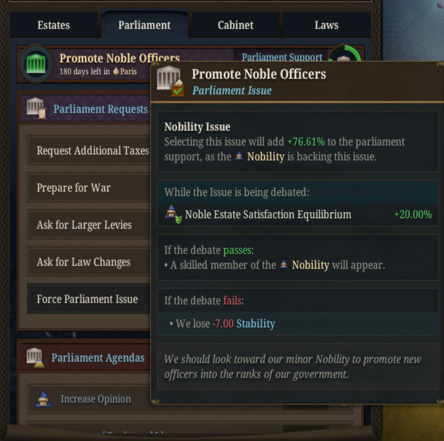 EU5には多様な議会制度が存在し多くは数年ごとに招集し、各社会階級の意見が反映されるようになります。議会を可能にする法律はゲーム開始時における大半の国家が有しています。議会は単なるボーナス付与の仕組みではなく、政治の複雑さを示し計画を進めるためにどれだけの譲歩をするかを選択させる役割を果たします。
