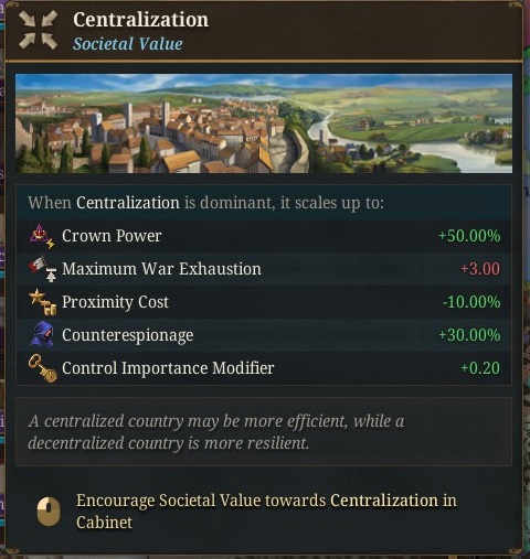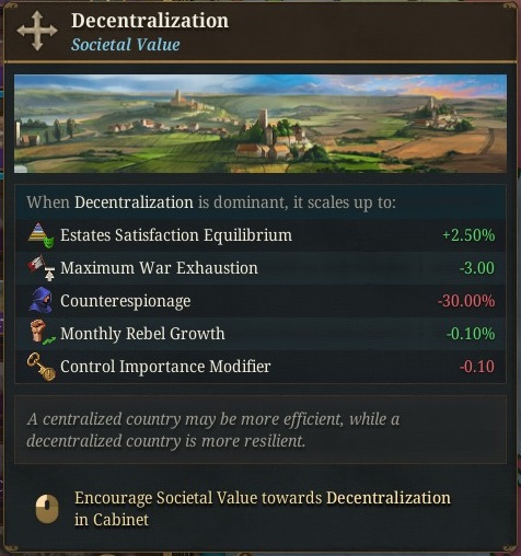 EU5では、以前のシリーズの政策スライダーを復活させ、対立する社会価値の理念をスライダーで表現しています。例えば、中央集権と地方分権、伝統主義と革新主義などがあり、いずれにも利点と不利な面が用意されています。国家がスライダー上のどこに位置するかによってさまざまな補正が発生します。